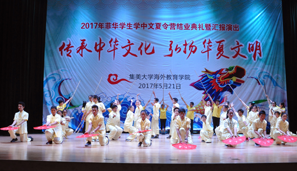 典礼结束后,菲华学员进行了汇报演出,展示了50多天以来的学习成果。中国歌曲大合唱、汉语小品、相声、诗歌朗诵、民族舞蹈、健美操、武术表演、国画书法作品展示等形式多样、内容丰富的精彩表演,充分表达了他们对中华文化的喜爱。
