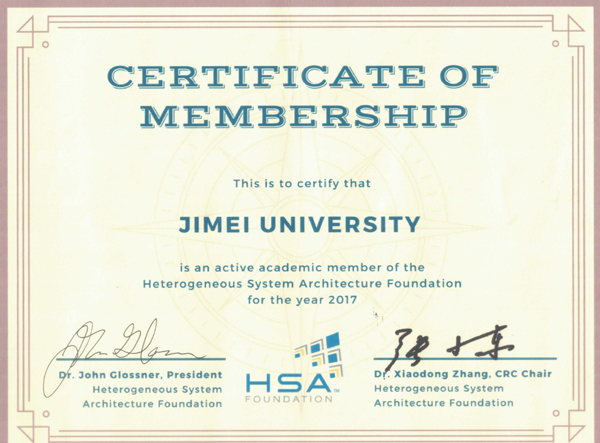 在近日于厦门召开的2017异构计算标准暨国际人工智能大会上,我校获准成为全球异构系统架构(HSA)联盟正式会员(Academic Level)并接受了联盟颁发的证书。