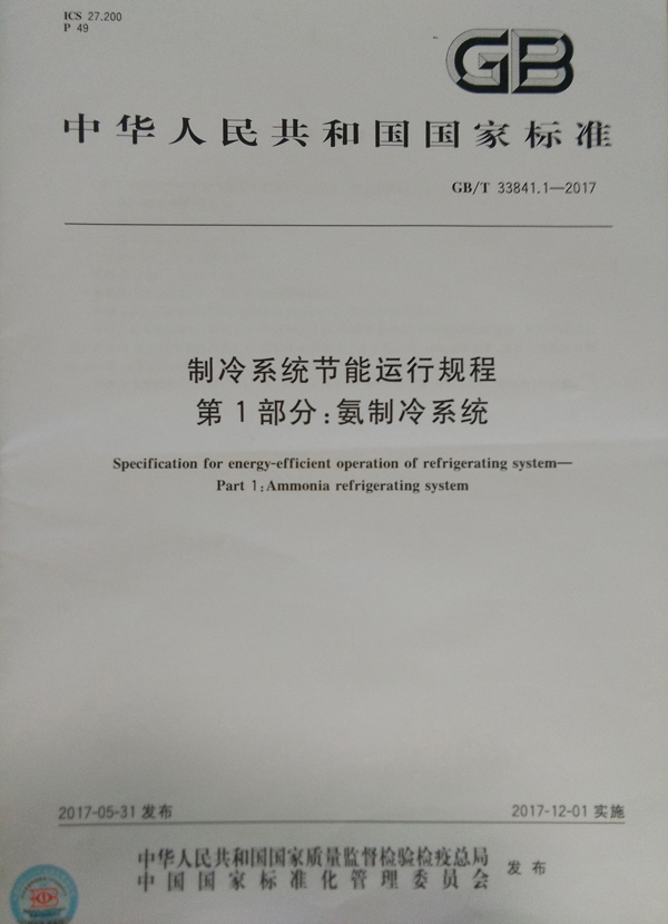 日前,已发布的我校机械与能源工程学院张建一教授主持的国家标准GB/T33841.1-2017制冷系统节能运行规程第1部分:氨制冷系统,由中国标准出版社出版发行,并将于2017年12月开始实施。