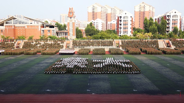 9月29日,我校于庄重文夫人体育中心举行2017级新生开学军训总结会暨军训汇报表演,2017级一万多名新同学参加了检阅。校领导李清彪、叶美萍、郑志谦、黄德棋、李克、曹敏杰,73051部队政治部主任韩波中校等参加了大会,大会由校党委常委、副校长黄德棋主持。