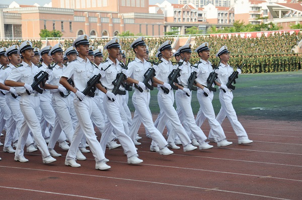 73051部队范翰翰少校主持分列式。来自各个学院的新生方阵以饱满的热情、整齐的步伐和豪迈的气魄展现了这场华丽的蜕变。诚毅学院960名新生组成创意方阵,体育学院、计算机工程学院、信息工程学院300名新生组成的匕首操方阵,航海学院与轮机工程学院360名新生的捕俘拳和综合拳表演等综合展示了我校此次军训的优秀成果。
