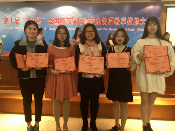 2017年12月29日至31日,第七届“华文杯”全国师范院校师范生英语教学技能大赛在闽南师范大学举行,我校外国语学院研究生吴萍、本科生陈丽燕获得特等奖,本科生苏妮娜、黄小玉、杨荣莹分别获得一等奖、二等奖和三等奖,我校获得优秀团体奖。