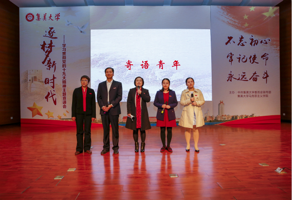 党的十九大以来,我校组建理论报告员队伍,深入各学院、各单位大力宣讲党的十九大精神和习近平新时代中国特色社会主义思想,宣讲党的十八大以来理论创新成果、建设成就,在统一思想、凝聚力量及进一步坚定党员干部师生员工“四个自信”方面发挥了积极作用。为进一步提升宣讲效果,校党委宣传部和马克思主义学院共同策划,以我校福建省首批思政名师工作室团队为依托,举办了“逐梦新时代”学习贯彻党的十九大精神主题宣讲会,我校思政名师通过分专题串讲解读对十九大精神进行整体梳理,中间穿插视频导语解说和校园师生采访同期声。该宣讲会采取新模式和新媒体手段,宣讲报告内容更加生动精彩,贴近师生实际、接地气,受到我校师生欢迎。
