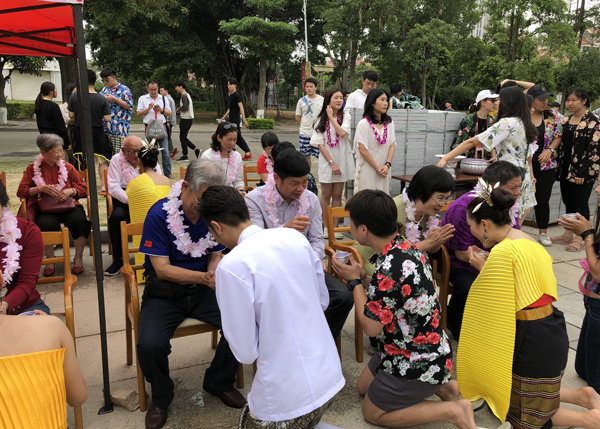 泼水节活动现场,泰国留学生们穿着自己的民族服装,向到场的领导和长辈们奉上浸有花瓣的香水并洒在长辈的手上,表示对长辈的美好祝福,然后长辈再将水淋在晚辈的头上,表示来自长辈的赐福。留学生们载歌载舞,拿起水枪、水瓢、水盆等道具,相互泼水祝福。现场热闹的气氛引吸了不少东南亚国家留学生和中国学生一起参加。