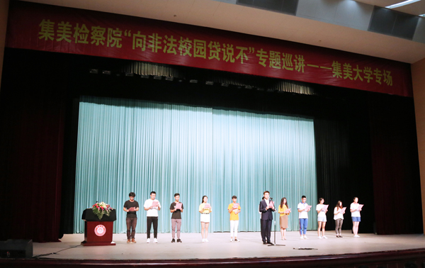 本次专题巡讲是集美区检察院开展抵制非法校园贷主题巡讲活动的第九场,通过图文展板、法律情景剧、专题宣讲、普法歌舞等形式,向在校师生传递非法校园贷的特征、危害以及预防和法治思维。