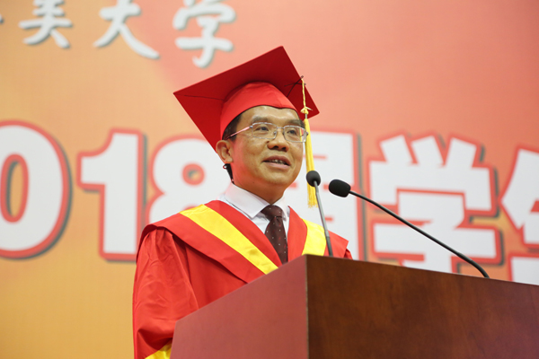 校党委书记辜芳昭为优秀毕业生代表颁发优秀毕业生证书,校长李清彪为毕业生代表颁发毕业证书并以充满诗意的语言发表了热情洋溢的讲话,表达了对全体毕业生的依依不舍和深深祝福。李清彪对即将踏入社会的全体毕业生提出两点希望:一是人生抢跑争风景,捷足先登上高峰。希望毕业生在人生“紧要之处”比别人早努力一点,早起步,快抢跑,捷足先登进入海阔天空的境界。二是时间碎片汇星河,心流有序梦成真。希望毕业生懂得充分利用闲暇时间并狠下苦功,把时间碎片串成星河,照亮青春前行的漫漫征途。副校长曹敏杰宣读授予2018届本科生和研究生学位决定、优秀毕业生表彰决定。