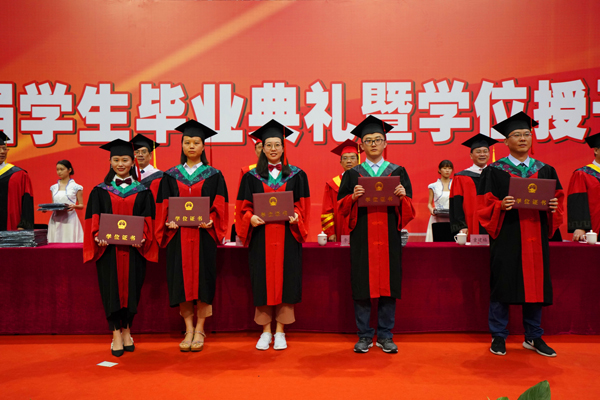 在最后举行的学位授予仪式上,校领导为全体到场毕业生拨正流苏,颁发学位证书并合影留念。