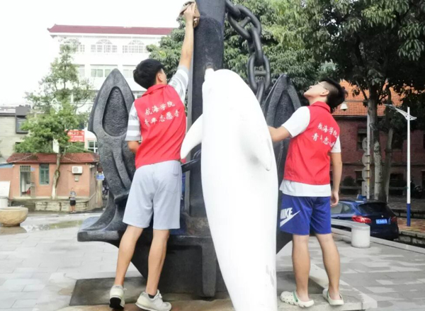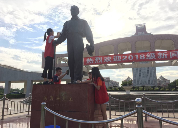 日前,我校组织100名校庆志愿者开展美化校园活动,集中清理学校东门嘉庚铜像、侨福雕塑长廊以及航海、轮机工程、美术、水产、财经、音乐等各学院校区的雕像、雕塑,使美丽的校园以更加清新亮丽的面貌迎接学校百年校庆。