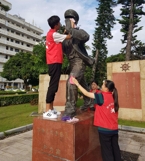 活动期间,志愿者们按照分工和计划,有条不紊、耐心细致地擦洗雕塑上和基座上的尘土,清除基座四周的杂草,使校园里的雕塑焕然一新。