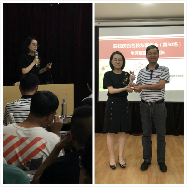 海外教育学院有关领导还为两位校友颁发了迎校庆百名校友报告会主讲嘉宾牌匾并致辞,对校友们在学业和事业上取得的成绩表示祝贺,希望聆听报告的新生借鉴校友分享的成功经验,认真规划学业和人生目标,并为此不懈努力。