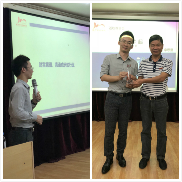 在题为《扬帆梦起——从大学到职场这一步》的报告中,李思显分享了他在学校学习期间的成长经历及走上工作岗位后所取得的成绩。他说,库克项目的《生涯规划与体验教育》课程让他有机会比其他毕业生更早接触金融行业,凭借对生涯规划的敏锐认知,2015年他选择了发展前景良好的财富管理行业,入职钜派投资集团。值此母校百年校庆来临之际,李思显说在母校求学的几年是他人生中最宝贵和美好的时光,表达了对母校的感恩之情,祝福母校明天更美好。