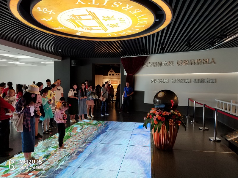 声光电等现代技术的综合运用,为参访者带来了现代化体验。序厅电视屏播放校庆宣传片及相关视频;地面体感互动屏有校园3D场景和校园360°全景画面;场馆的每个部分都设置了电子触摸屏,提供了深度展示内容,可供参观者查阅相关信息。