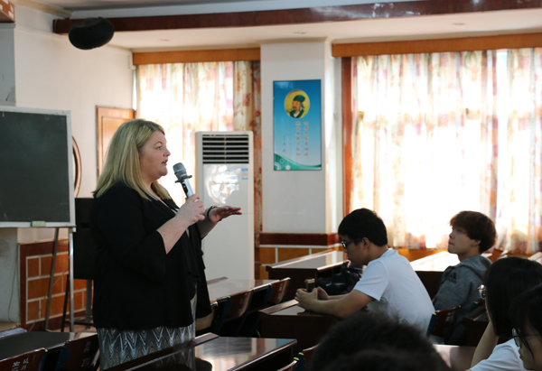 座谈后,Nicola Lynch还为我校教育部留学服务中心战略合作伙伴项目2018级新生做了关于留学英国德比大学的讲座。在讲座中,她从校园环境、办学特色、专业设置和社团活动等方面介绍了留学英国德比大学的优势,并当场为同学们上了一堂商业示范课,让同学们体验英式课堂氛围。Nicola Lynch还受邀参加了我校百年校庆纪念大会、“诚毅颂”文艺晚会等校庆活动。