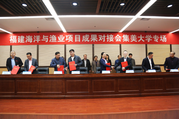 福建省海洋与渔业局征集了福建省企业技术需求,我校发动校内各科研平台及机构等提出合作项目、科技成果和意向性合作单位,共促成福建金荣达水产发展有限公司、福建天马科技集团股份有限公司、福建省万利鸿海珍品有限公司等企业代表在会上与我校食品与生物工程学院、水产学院、轮机工程学院等签约,共签约16个项目。