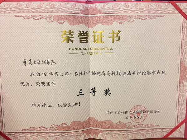 5月25日-26日,由福建省教育厅主办,福建省法学会、福建师范大学承办,福建名仕律师事务所协办的第六届“名仕杯”福建省高校模拟法庭辩论赛在福建师范大学旗山校区举行,来自我省的18个高校代表队参赛。经过初赛、半决赛、决赛的激烈角逐,由法学院李梦超、王艳、夏晓榕、范敏、万欣涛、李妍等6位学生组成的我校代表队获得季军。