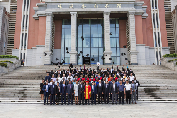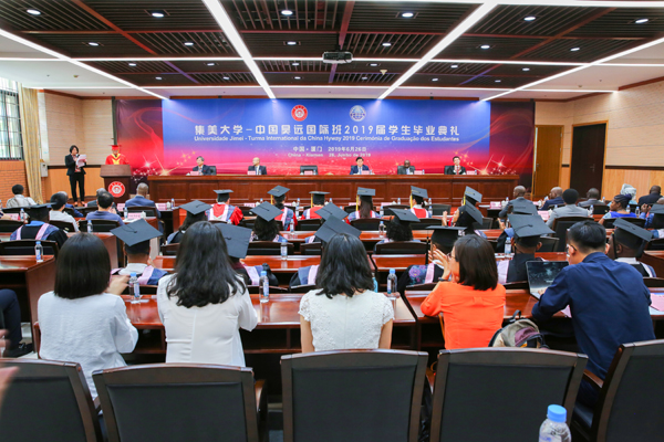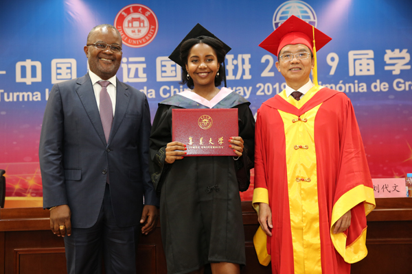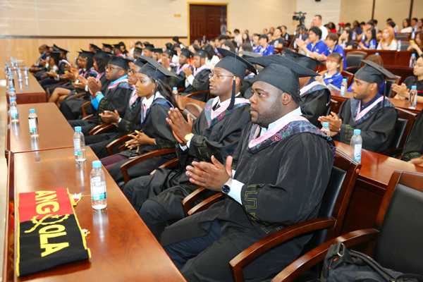 6月26日上午,我校中国昊远国际班2019届学生毕业典礼在尚大楼103会议室举行。安哥拉驻华大使若昂•桑托斯•内图、安哥拉驻广州总领事馆副领事安东尼奥一行,中国昊远集团有限公司董事长刘代文、总裁胡家铭、副总裁司绪斌、副总裁魏瑞海,我校校长李清彪、副校长曹敏杰以及学校办公室、学生处、国际合作交流处、教务处、招生办、财经学院、海外教育学院领导、老师和32名安哥拉留学生及其家长参加了毕业典礼。