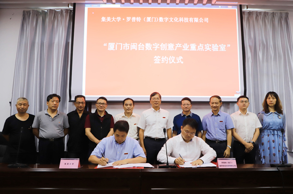 10月19日下午,我校美术与设计学院与罗普特(厦门)数字文化科技有限公司举行“厦门市闽台数字创意产业重点实验室”签约仪式。副校长曹敏杰,罗普特科技集团股份有限公司总裁江文涛,数字创意技术装备创新产业联盟副理事长陈万胜,学校相关部处领导,美术与设计学院领导和校友代表出席了签约仪式。