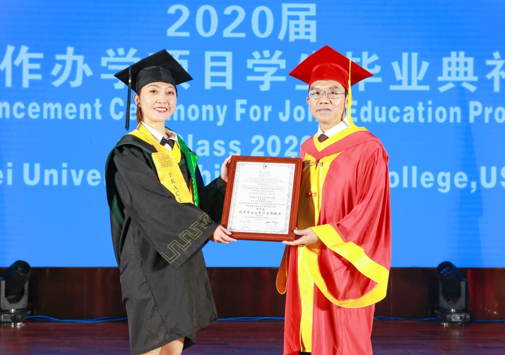 今年受疫情影响,毕业生无法如期返校学习,但他们不仅居家认真完成线上学习,还主动参与家乡抗疫志愿服务;毕业校友慷慨解囊向母校捐赠大量防疫物资,与母校共克时艰,以行动诠释青年一代的责任担当。为了弥补毕业生无法回校参加毕业典礼的遗憾,海外教育学院领导到毕业生代表家中走访,了解毕业生的需求;学院为毕业生寄送学士服,精心策划“云”毕业典礼;美国库克大学的校领导虽然无法像往年一样亲临现场致辞和颁授学位证书,但仍用心录制了视频致辞和采用同步云视频方式向毕业生表达祝福和希望。中美两校领导老师同心协力为2020届毕业生献上了一台意义非凡的“云”毕业典礼,这不仅展现了中美教育文化交流事业的坚实根基,也彰显了合作双方在疫情之下携手同心共渡难关的深厚情谊。