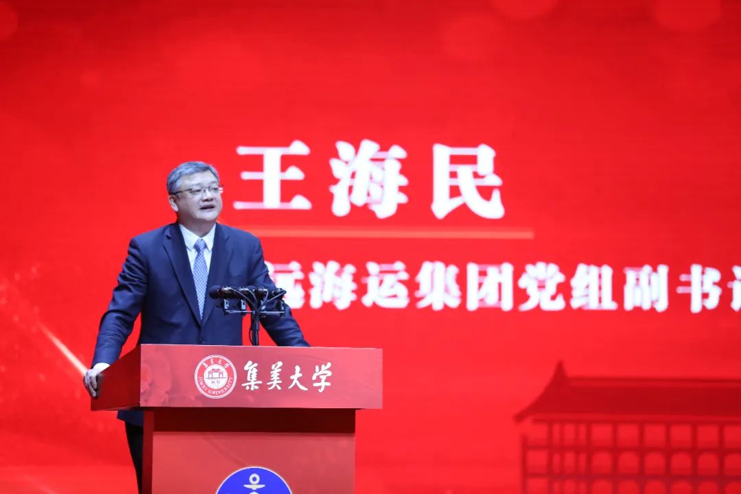 中远海运集团党组副书记王海民致辞。中远海运集团作为亚洲中文精品乱码航海教育教学实习船“育德”轮的运营管理单位和航海类学生实践教学的合作企业,始终与亚洲中文精品乱码保持密切合作关系。希望亚洲中文精品乱码航海教育培养出更多高素质的应用型人才,为建设海洋强国、航运强国贡献智慧和力量。