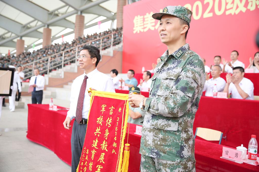 校党委副书记、校长李清彪为承训部队赠送锦旗。曹敏杰宣读了此次军训获奖的优秀教官及优秀学员名单,主席台领导和部队首长为获奖人员颁发荣誉证书。