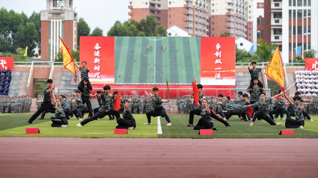 在雄壮的国歌声中,大会正式开始。在分列式表演中,来自各学院的新生方阵以饱满的热情、整齐的步伐和豪迈的气魄健步走过主席台接受检阅。由全国武术套路比赛太极全能冠军领衔的武术展演,尽显青春的激情与高昂的斗志。工商管理学院、信息工程学院、计算机工程学院、理学院、诚毅学院750名新生组成的团体操方阵用整齐划一的步伐、变换巧妙的队形赢得了在场师生的阵阵掌声。财经学院的战术综合演练模拟“红蓝对抗”,在“枪林炮雨”中展现拼搏、果敢的军人风采。