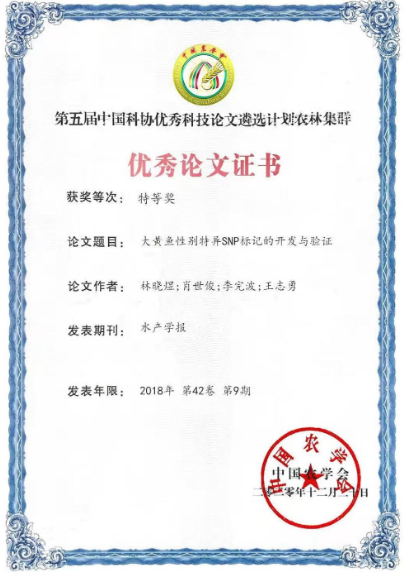 近日,中国科协组织评选第五届优秀科技论文,经过各学科领域专家推荐、初评遴选、终评审定,有96篇论文入选。这些论文是2016年1月1日以来发表在我国科技期刊上的优秀论文代表。我校《大黄鱼性别特异SNP标记的开发与验证》获得中国农学会颁发的“第五届中国科协优秀科技论文遴选计划农林集群”特等奖。该论文第一作者是水产学院2015级硕士研究生林晓煜,通讯作者是王志勇教授,该篇论文发表于《水产学报》2018年第9期。