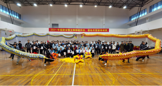 培训班邀请7位国际级裁判员、国家C级以上资格的教练员针对舞龙舞狮的历史文化传承与发展、竞赛规则、裁判法、临场实践,进行全面的培训与考核。福建省龙狮运动协会会长林宗杰、副会长陈仁忠为考试合格的学员颁发培训班结业证书。