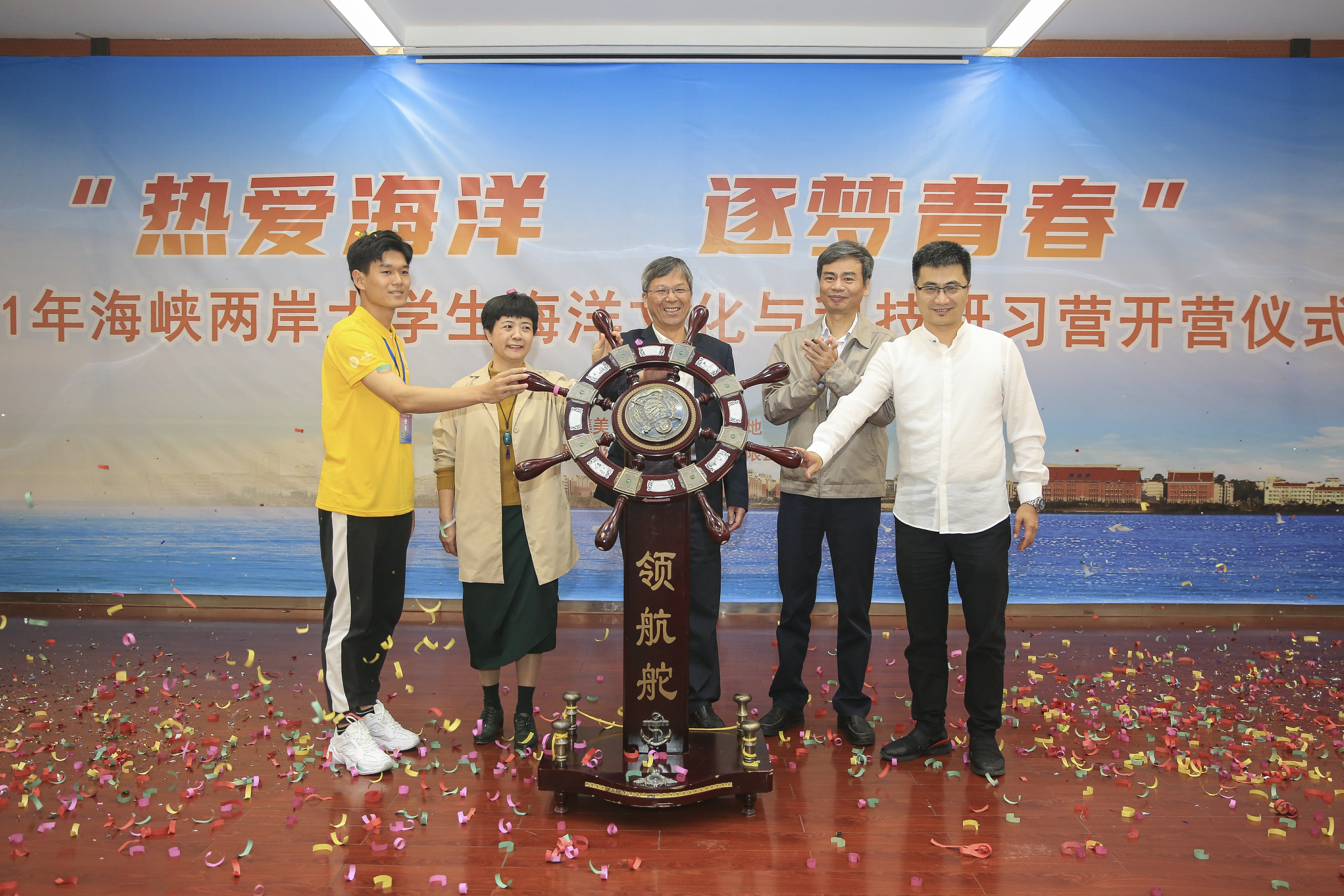 出席仪式的嘉宾共同为研习营开启“领航舵”,并向研习营营长授旗,2021年海峡两岸大学生海洋文化与科技研习营正式开营。