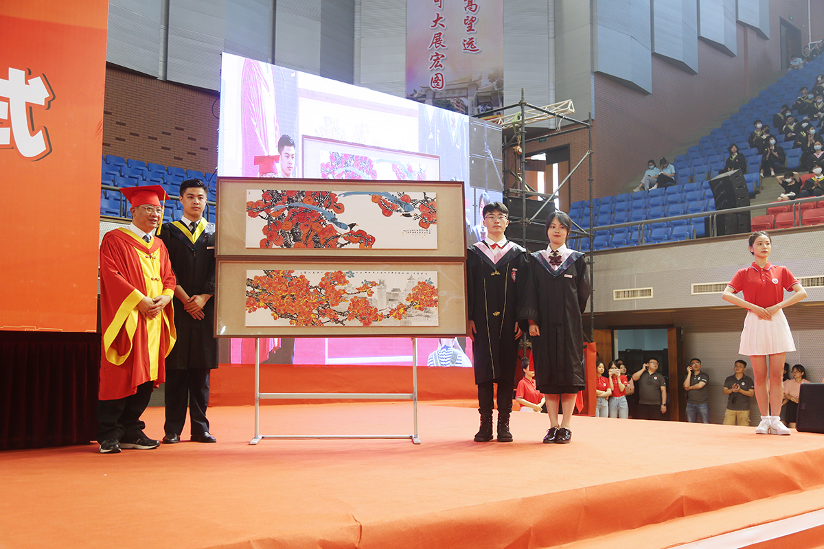 毕业典礼上,全体毕业生代表进行了庄严的毕业宣誓,表达了“复兴栋梁,强国有我;征途漫漫,唯有奋斗”的铮铮誓言,铿锵有力、朝气昂扬的声音在场内回荡。2022届毕业生代表精心创作了《凤凰花开》和《柿柿如意》的绘画作品献给母校,并向教师代表敬献鲜花,表达对母校及老师的感恩之情。