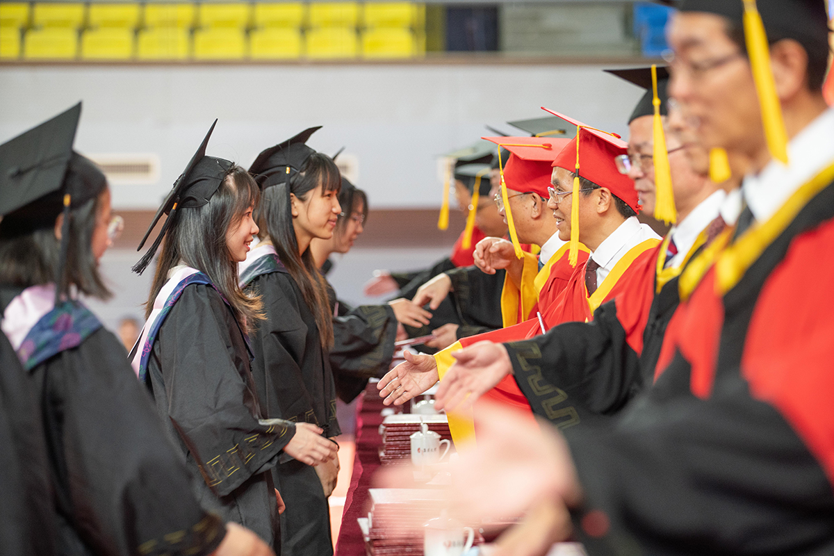在学位授予仪式上,全体校领导、校学位评定委员会委员、学院领导为全体毕业生拨正流苏,颁发学位证书并合影留念。