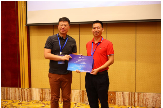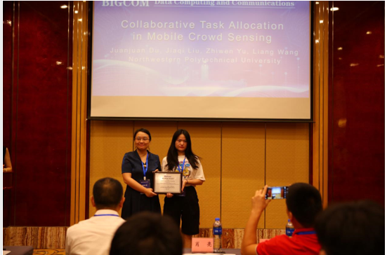 厦门大学肖亮教授为西北大学“Collaborative Task Allocations in mobiles Crowd Sensing”作者杜娟娟颁发最佳论文奖。