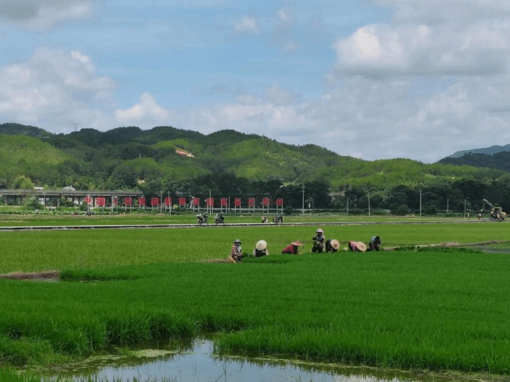 长汀县河田镇露湖村村民在万亩农田中耕种的情景。