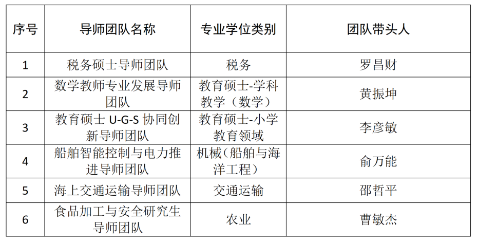 近日,省教育厅公布了省级专业学位研究生导师团队建设项目验收结果,我校税务硕士、教育硕士-学科教学(数学)、教育硕士-小学教育、机械硕士、交通运输硕士、农业硕士等6个团队通过省级验收。