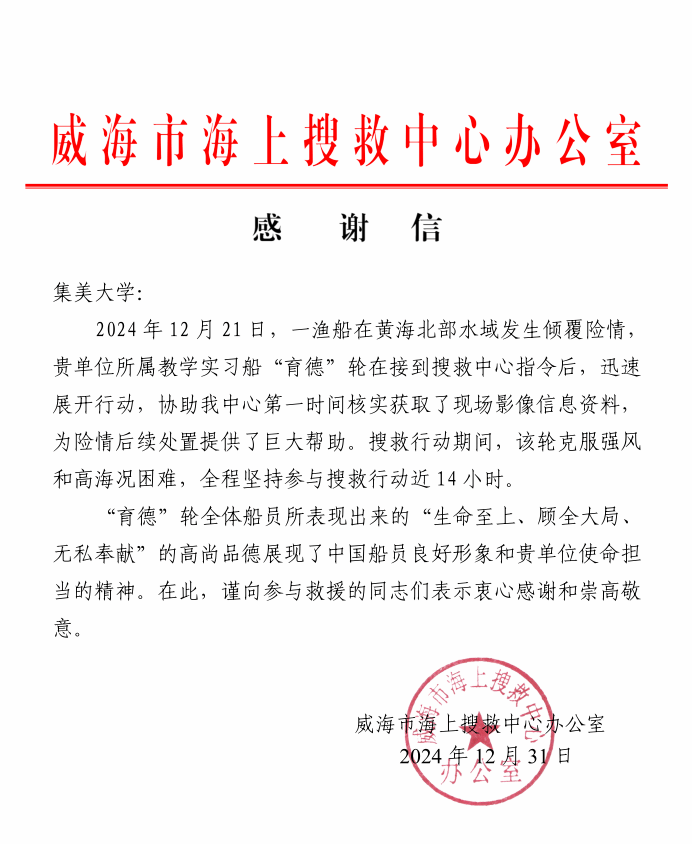 近日,我校收到威海市海上搜救中心办公室发来的感谢信,对参与海上搜救行动的“育德”轮师生表示肯定与感谢。