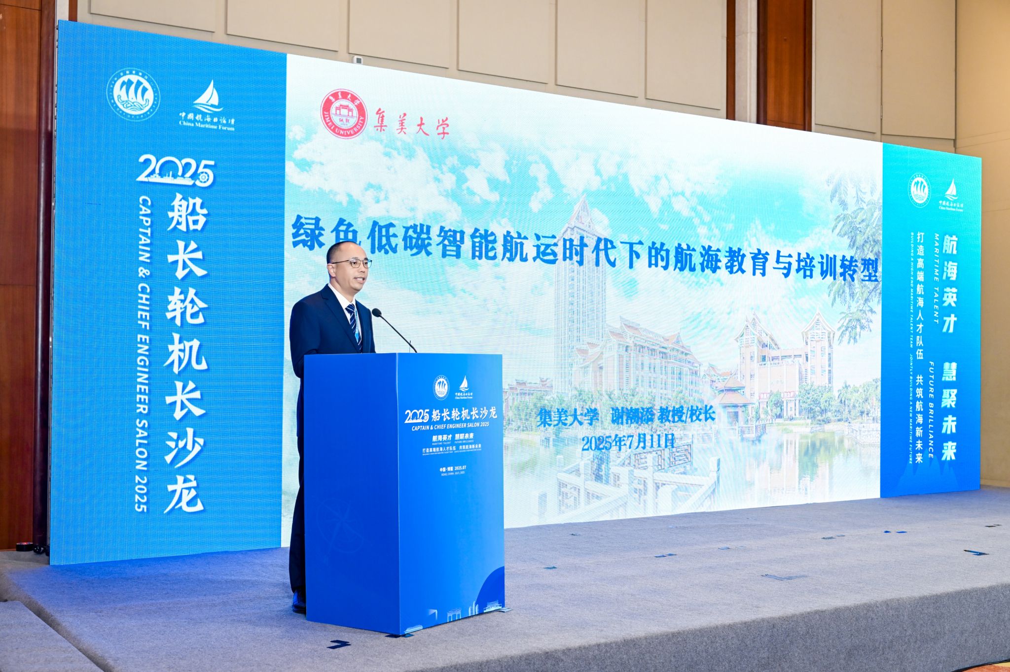 谢潮添先后出席主论坛、航运新质生产力发展研讨会、船长轮机长沙龙等活动,并应邀在船长轮机长沙龙上作题为《绿色低碳智能航运时代下的航海教育与培训转型》的主题报告。他分析了绿色低碳智能航运时代背景及对航海人才的要求,介绍了我校航海教育与培训的转型实践,并就“政企校研”协同共育绿色智能航海人才提出建议。