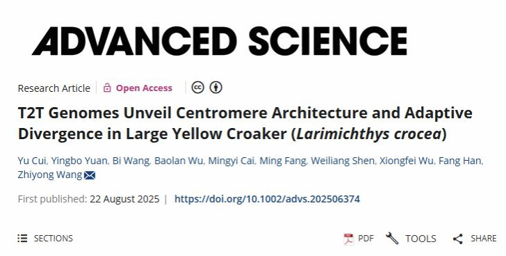 近日,我校水产学院王志勇教授团队在Advanced Science杂志上发表题为《T2T Genomes Unveil Centromere Architecture and Adaptive Divergence in Large Yellow Croaker (Larimichthys crocea)》的研究论文。该研究提供了迄今为止最完整的闽-粤东族和岱衢族大黄鱼参考基因组;同时,结合多组学数据系统解析了着丝粒特征及5S rRNA分布模式,开展了不同种群大黄鱼适应性演化分析,为大黄鱼重要经济性状遗传机制解析和遗传改良工作的开展提供了重要基础。