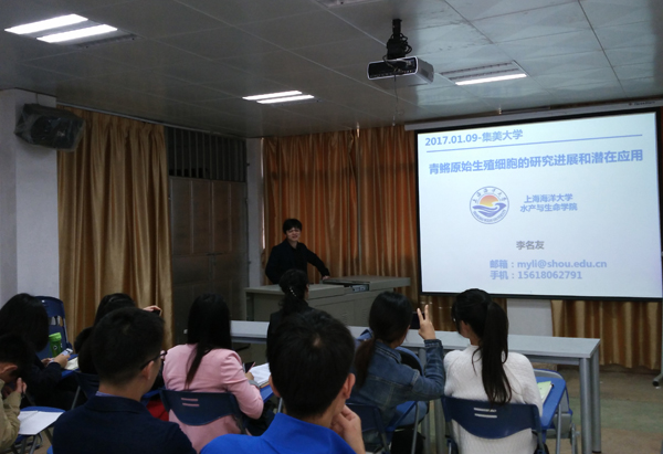 1月9日上午,上海海洋大学水产与生命学院鱼类干细胞实验室李名友研究员应邀来水产学院进行学术交流,并作了题为“青鳉原始生殖细胞的研究进展和潜在应用”的学术报告。学院遗传育种及生物基础等研究团队的师生聆听了报告。