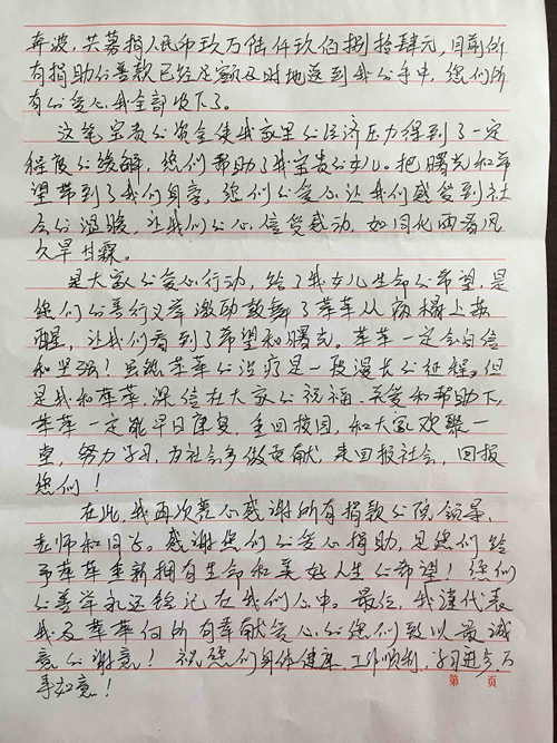 此前,学院领导、师生、校友、社会各界人士通过多种渠道传递爱心接力、慷慨解囊,共为陈萃萃募集善款35万余元,为陈萃萃的治疗提供了有力资金保证。对学院领导和学院师生、校友、社会各界人士一直以来对陈萃萃的关怀、支持和善举,陈萃萃父亲、母亲非常感动,并于1月10日特地送来一封感谢信(附后)。