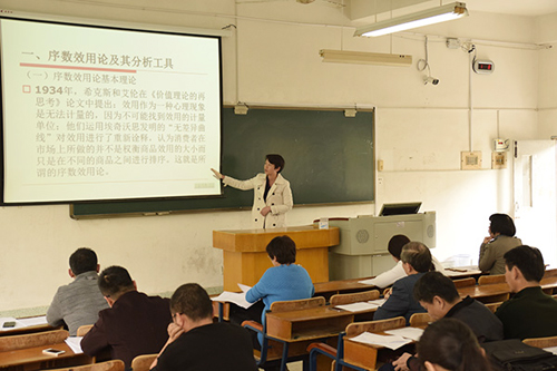 7位参赛老师在台上各展风采。金融系黄纯灿老师用实际案例结合演算方法讲解了多重共线性的相关知识;会计系刘小南老师以存货估值为主题讲述了其教学重难点以及解决办法;会计系张贤萍老师以中海釜山公司抽逃资金为案例展示了内部控制的重要性和意义;经济系陈莹老师详细讲述了序数效用论和消费者均衡的知识;经济系王娟老师结合图形生动地讲解了供求原理和弹性理论;会计系李治国老师从5个不同方面讲授了审计目标的实现过程;国贸系高云端老师讲述了国际海上货物运输市场的分布与经营,并以韩进的破产为例分析了国际航运市场形势。
