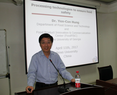 访问交流期间,洪延康为学院师生作了题为“Processing technologies to ensure food safety”的学术报告。报告中,洪延康结合自己研究团队的研究成果,深入浅出、形象生动地介绍了食品冷藏保鲜、生鲜处理技术及其在水产品加工领域中的应用等食品安全与加工领域的前沿科学问题;分享了结合佐治亚州当地的农产品加工业的特点进行产学研合作的心得体会和宝贵经验。他还介绍了佐治亚大学的概况,表示欢迎学院师生到佐治亚大学交流、学习;就如何通过加工消除食品中过敏原、电解水处理生鲜食品的食品安全以及水产品的保鲜和流通等问题与学院师生进行了热烈的讨论,