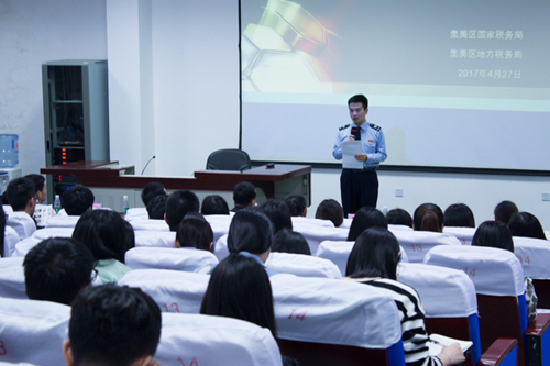 会上,学院党委副书记陈志鸿指出,学院以培养应用型创新人才为目标,高度重视学生的专业实践,对集美区地税局和国税局对学院工作的大力支持表示感谢,并期待学院与它们有更深入的合作。王俊青讲述了当前国家对创业的支持状况,并祝愿同学们在未来职业生涯中能有所成就。集美区国税业务骨干代表,从大学生创新创业税收优惠政策、办税的步骤及相关注意事项讲解了《新办企业涉税事项辅导和税收优惠政策》。
