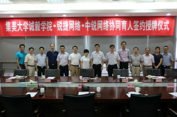 7月12日下午,我校诚毅学院与锐捷网络、中锐网络协同育人签约授牌仪式在学院景祺楼17楼会议室举行,这标志着学院校企合作培养育人平台又添新项目。