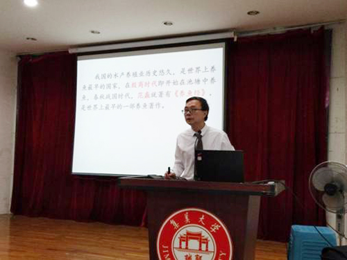讲座中,陈家友从我国水产养殖的历史出发,用详实的数据讲述了我国水产养殖的当前发展现状及未来的发展机遇;介绍了水产生物的相关知识,期望同学们能够提高专业学习兴趣,成为水产界的生力军。他还分享了其在桑给巴尔和圭亚那的亲身经历和见闻,鼓励同学们学好水产、走向世界。