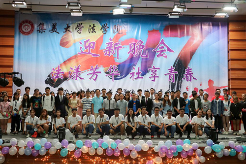 近日,法学院“法漾芳华,社享青春”2017迎新晚会在月明楼报告厅举办。法学院党委副书记郑秀坤,学院老师、辅导员代表等出席了晚会,法学院各学生组织成员、相关兄弟学院学生会学生干部、2017级全体本科生和部分马克思主义中国化研究专业的研究生参加了晚会。