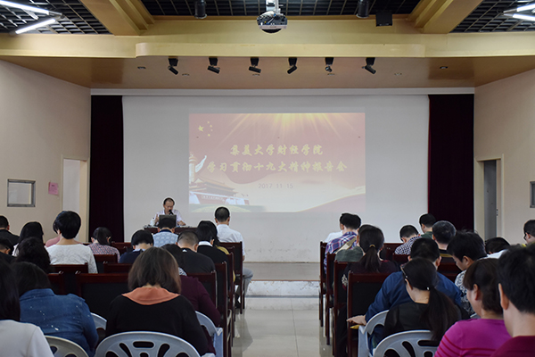 11月15日下午,财经学院召开学习贯彻十九大精神报告会,报告会由学院党委书记周邵生主讲、党委副书记陈志鸿主持。学院全体教职工参加了报告会。