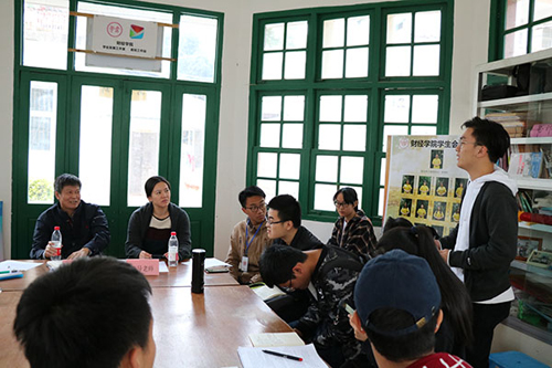 活动现场,两位指导老师与学生面对面交流。针对学生提出的课程设置问题,黄书猛介绍了学院各专业特点,认为无论是理论经济学科还是实践经济学科,同学们都要将理论知识联系社会实际进行思考。黄书猛指出,读书是积淀的过程,不应带着功利性去阅读,建议在校生多利用图书馆及专业网站的资源去拓宽阅读面和提高阅读量。针对职业替代性问题,黄书猛用择业方向观、终身学习观来说明人工智能并不会完全取代人工。关于创业问题,黄书猛建议学生在创业过程中应注重品牌意识及自身能力展示,陈蕾认为同学可从当下生活入手选择创业项目,多实习,从而更好地找准未来择业方向。