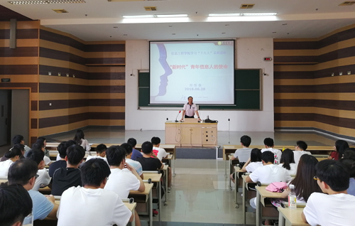 6月28日下午,信息工程学院副院长郑佳春为学院15级全体学生上了一堂主题为“新时代青年信息人的使命”的形势与政策课。