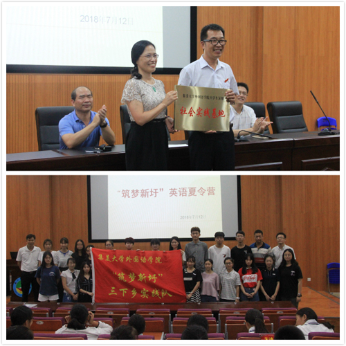学院、新圩学校有关领导,新圩学校英语任课老师、学院20名实践队员和新圩学校160名学生参加了夏令营开营式。双方领导还进行了外国语学院暑期大学生社会实践基地签约仪式,并为基地授牌。