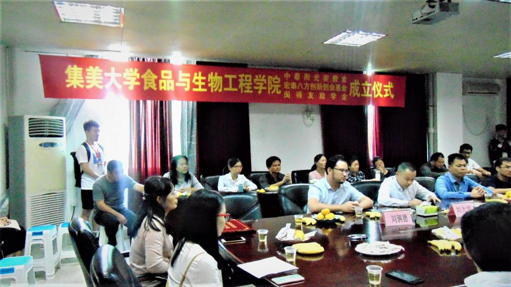 10月20日下午,食品与生物工程学院举行“中泰阳光”奖教金、“宏泰八方”创新业基金、“闽得友”学生助学金三个基金成立仪式。仪式由学院党委书记杨一青主持,校友苏章申、刘俩德、周教德,学院院长刘光明及部分师生代表出席。