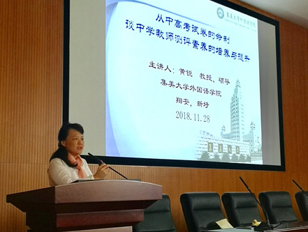 11月28日,“学科专家走进翔安”专题研讨会在翔安新圩学校举行,我校外国语学院院长黄锐应邀作题为《从高考试卷的命制谈中学教师测评素养的培养与提升》的报告。